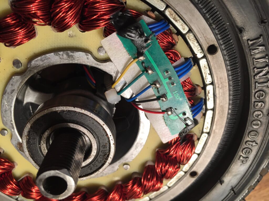 Hall effect sensors connected to the circuit via three group of three blue wires in a BLDC motor